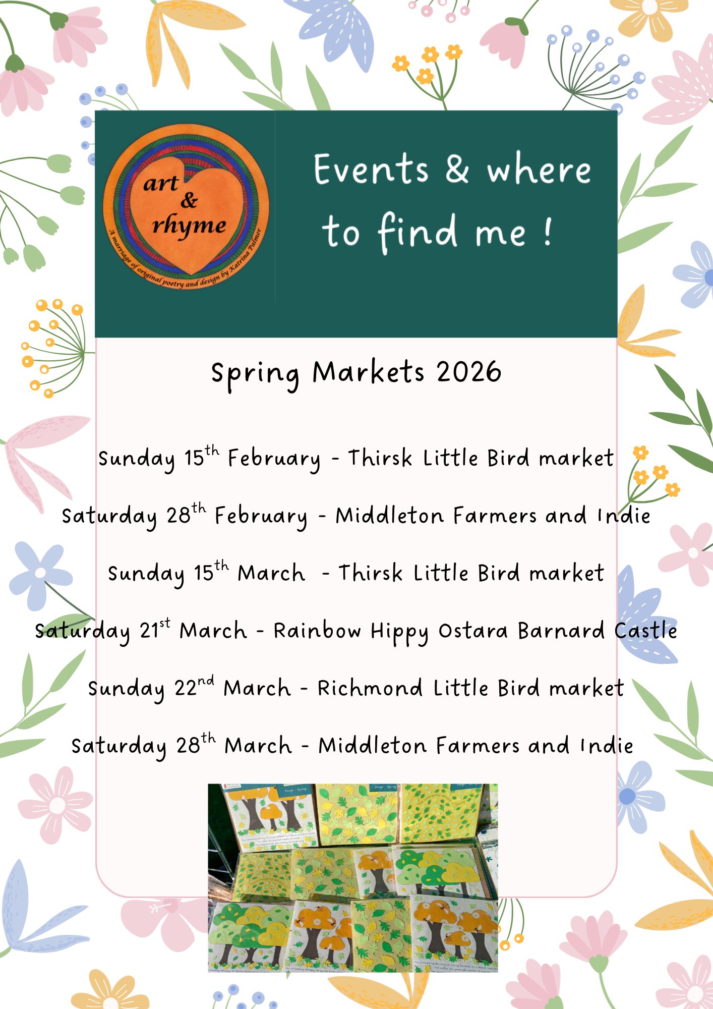 Upcoming events.Find out where to find my market stall and special events I am attending Feb 15 to 28 Mar Spring Markets 2026 Sun, 15 Feb 2026 10:00 Sat, 28 Mar 2026 11:00 Google Calendar ICS View Event → Mar 21 Rainbow Hippy Events Saturday 21 March 2026 10:00 11:00 Google Calendar ICS View Event → Nov 1 to 29 Nov November markets Sat, 1 Nov 2025 11:00 Sat, 29 Nov 2025 12:00 Google Calendar ICS View Event → Nov 1 Book Signing and Poetry Recital Saturday 1 November 2025 10:00 16:00 Google Calendar ICS View Event → Sept 20 Book Signing and Poetry Recital Saturday 20 September 2025 10:00 16:00 Google Calendar ICS View Event → Aug 28 Market Stalls in September 2025 Thursday 28 August 2025 08:00 09:00 Google Calendar ICS View Event → The aim of art is to represent not the outward appearance of things but their inward significance (Aristotle)